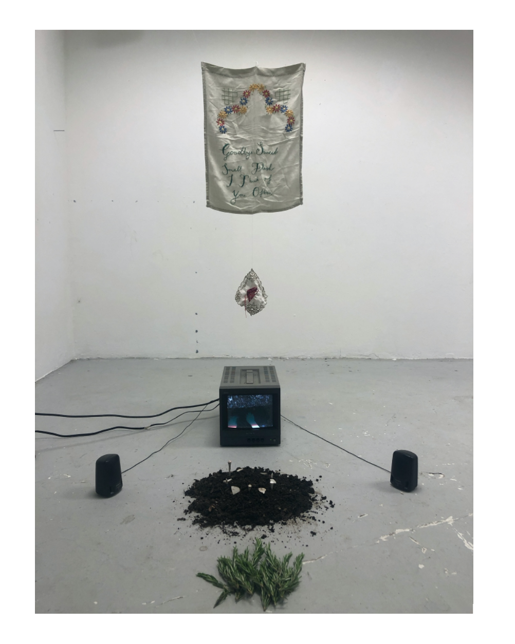 Multimedia Installation: film, audio, embroidery, soil, rosemary